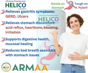 Helico Syrup by ARMAA Homeopathy is formulated to help manage symptoms linked to H. pylori, chronic gastritis, and acid reflux.
